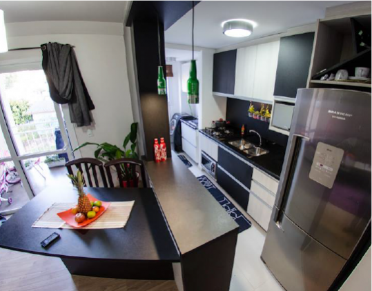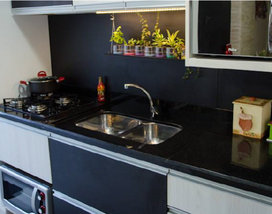 Cozinha moderna, com jogo de cores em preto e branco.