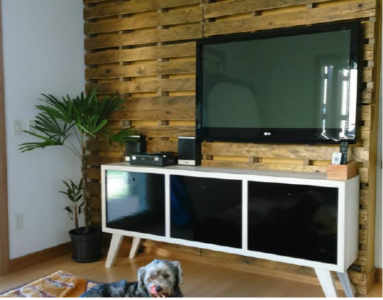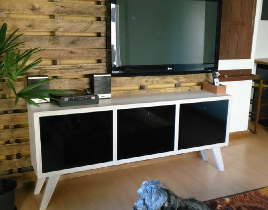 Sala de TV, com aparador e painel em palets.