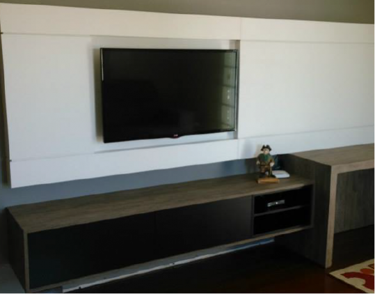 Sala de TV com aparador amadeirado e painel em melamina branca.